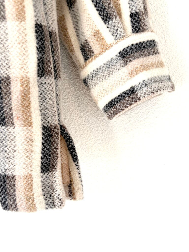 APC wool button up shirt in a cream, black and tan plaid features a patch chest pocket and side seam vents. Size Small.