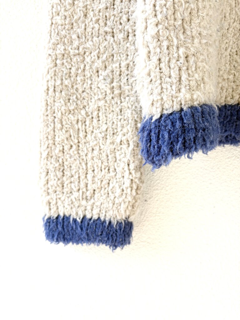 Giu Giu boucle sweater in cream with blue trim features four snaps at the neck. Size small.