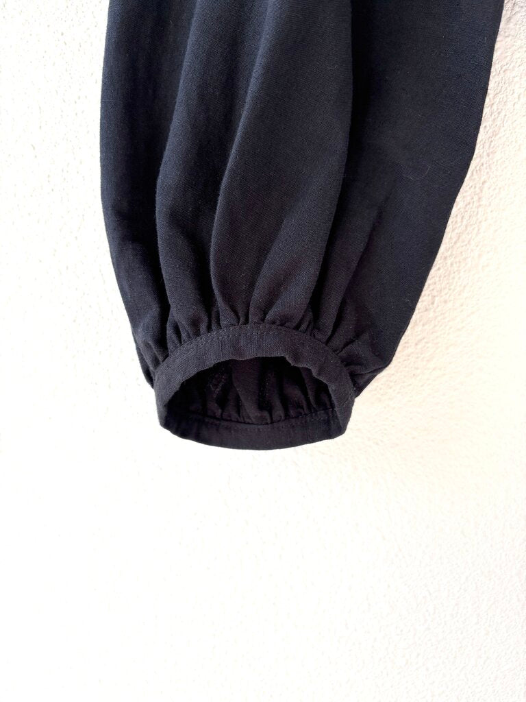 Lemaire zipped blouse in a black cotton linen blend is a cropped style featuring a zipper up the front and gathering at the collar and cuffs. Size 38.