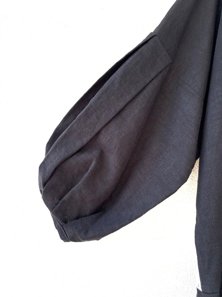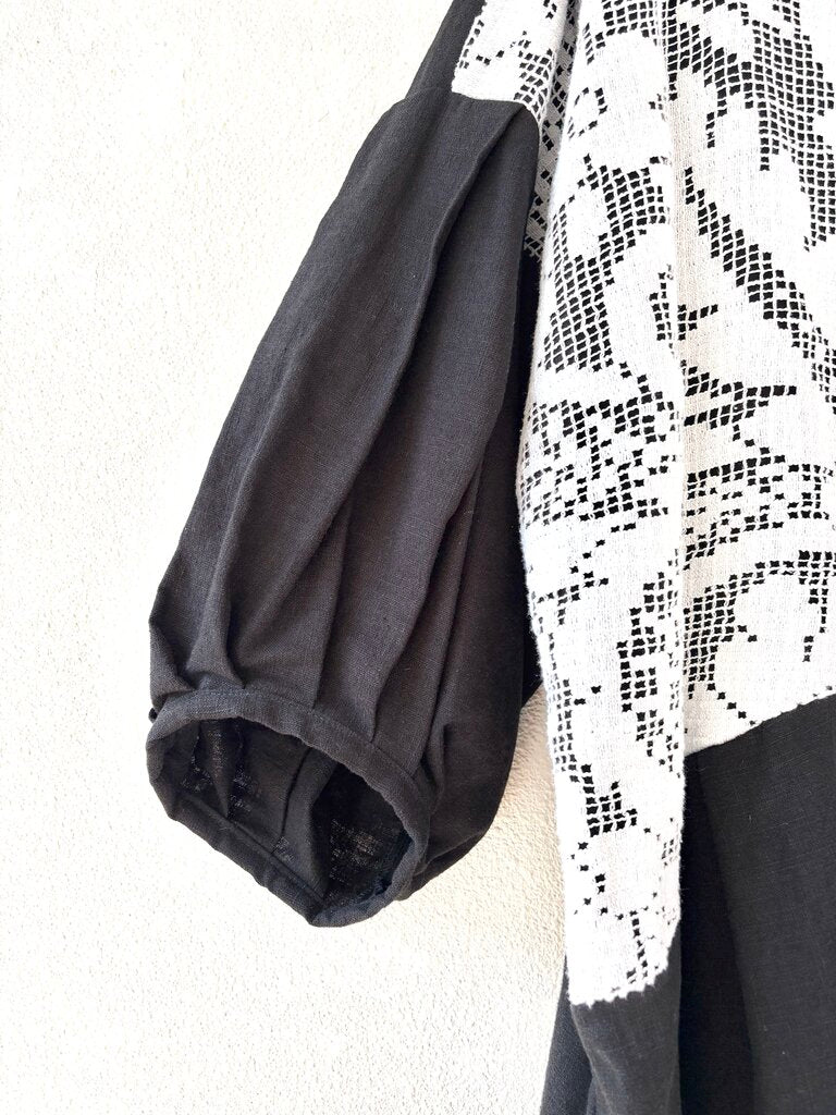 Museo dress in black linen with a panel of vintage lace at the front features balloon sleeves, side seam pockets and a drop waist with a gathered skirt for an easy roomy fit. Size 2XL/3XL