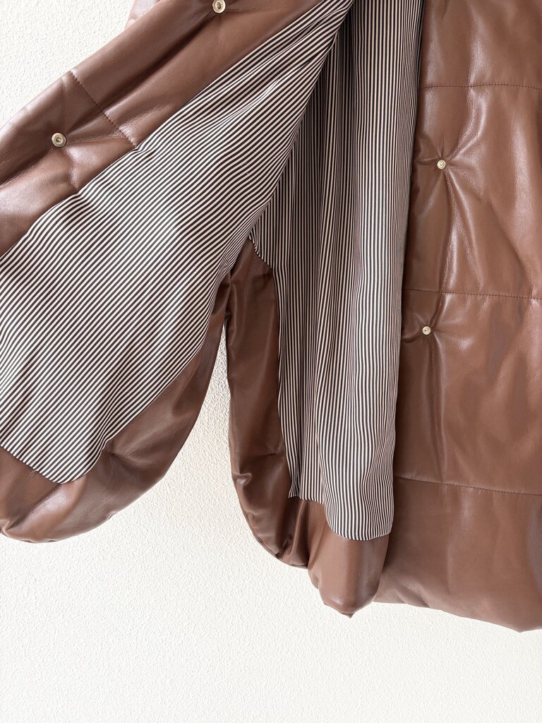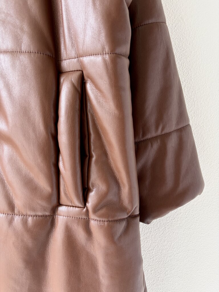 Nanushka 'Eska' puffer jacket in brown vegan leather features welt pockets at the waist, snaps up the front, a stand collar and a rounded hem with vented side seams. Size small.