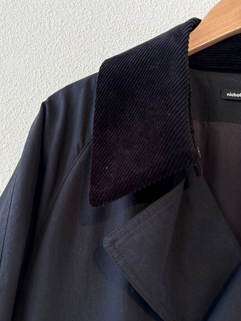 Nicholson & Nicholson 'Gentle Trench' is inspired by a vintage trench coat from the 1960s in a black cotton-nylon woven gabardine. This lightweight double-breasted coat features a double collar with a detachable corduroy collar, adjustable cuffs, raglan sleeves, side angled pockets, a back vent and a relaxed fit. Size 41.